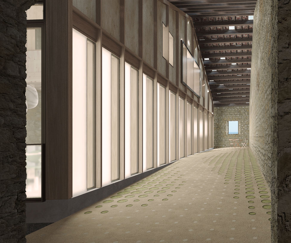 Ausgewählte Dachziegel durch abgestimmt siebgedruckte Glasziegel ersetzen. Natürliches Licht im Innenhof intensivieren.